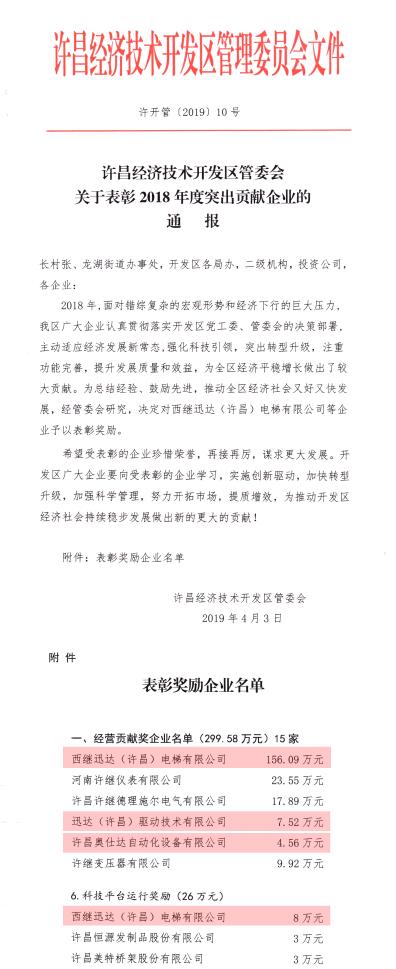 4月12日,西繼迅達(dá)電梯在經(jīng)濟(jì)技術(shù)開發(fā)區(qū)管委會(huì)召開的2019年度工作會(huì)議上,被開發(fā)區(qū)管委會(huì)通報(bào)表揚(yáng),授予經(jīng)營貢獻(xiàn)獎(jiǎng),并給予156萬元現(xiàn)金獎(jiǎng)勵(lì),位列經(jīng)營貢獻(xiàn)獎(jiǎng)企業(yè)首位。此外,西繼迅達(dá)還被授予8萬元科技平臺(tái)運(yùn)行獎(jiǎng)勵(lì)。