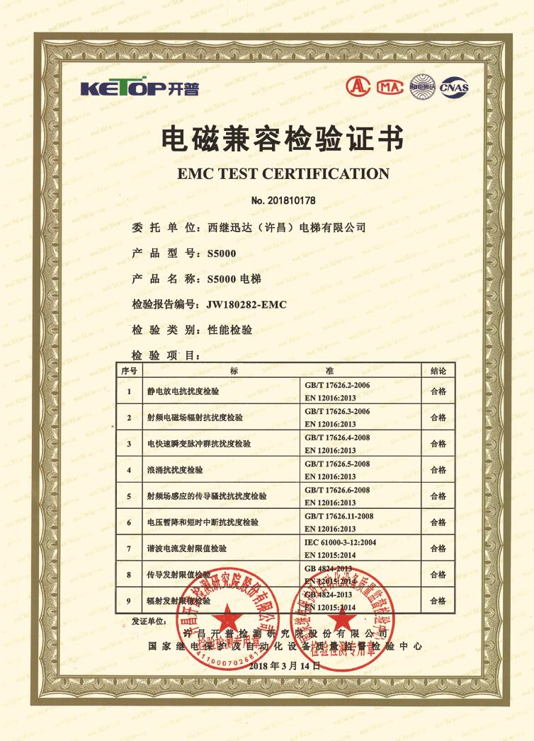 西繼迅達整梯通過電磁兼容EMC檢測