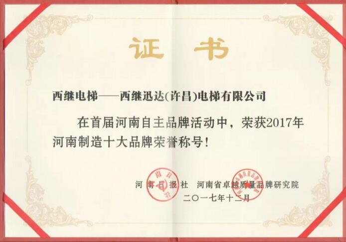 西繼迅達(dá)榮膺“2017年度河南制造十大品牌”殊榮